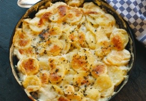 In a small bowl, combine milk & cream, add /minced grated garlic and salt & pepper to taste. Add remaining thyme, if you have any, and give everything a good stir. Pour all of it over the potato/rutabaga mixture in your pan. The cream mixture will thicken as the potatoes release their starch, so don’t worry if it looks a bit too soupy at first. Cover pan and cook in a 375F oven for approx. 30-45 min, until potatoes & rutabaga are tender and easily pricked with a fork. Uncover, sprinkle remaining Gruyere over the top and brown until the broiler until cheese is nicely melted, a bit browned on the edges & bubbly.