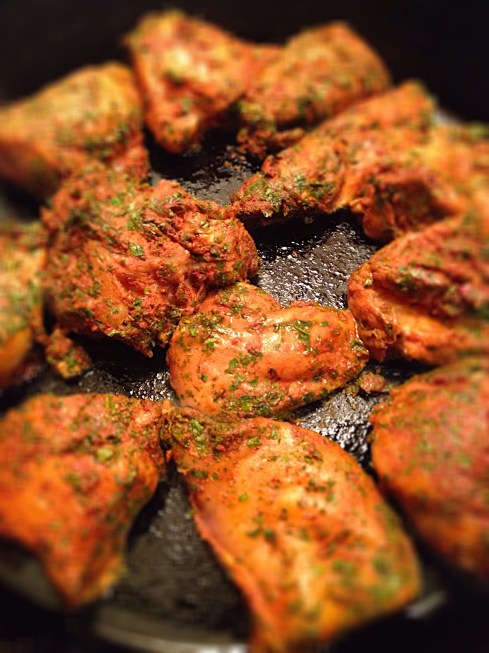 Toss all the spices together and blend with the pressed garlic & lime juice. Coat the raw, rinsed chicken in the spice paste, toss with the chopped parsley and marinate in the fridge for at least 2 hours. Take out of the fridge, and let rest for another 10-15 minutes.